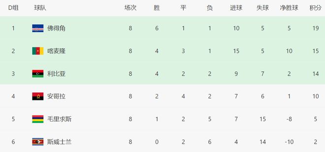 8轮过后,佛得角6胜1平1负积19分,坐稳小组第一的同时,甩开排名第二名的喀麦隆4分,仅剩两轮情况下,直接出线形势一片大好。